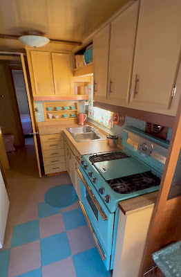 | The kitchen in the Spartan: classic Mid-Century design with pastel colors. |